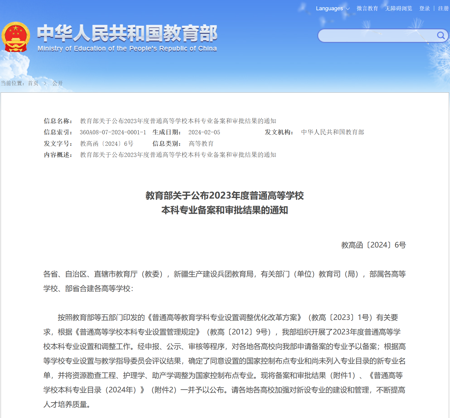 3月19日,教育部下发《教育部关于公布2023年度普通高等学校本科专业备案和审批结果的通知》(教高函〔2024〕6号),色情av申报的人工智能、机器人工程、虚拟现实技术、大数据管理与应用4个新专业全部获教育部备案和审批,可于2024年秋季开始招生。