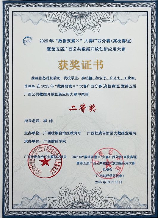 近日,“数据要素X”大赛广西分赛(高校赛道)暨第五届广西公共数据开放创新应用大赛于广西财经学院举行。在这场汇聚了众多高校精英的激烈角逐中,我校信息工程学院学子凭借卓越的实力与不懈的努力,脱颖而出,斩获区级二等奖一项、三等奖两项的优异成绩,为学校赢得了荣誉。