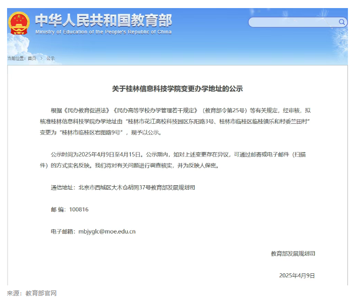 4月9日,教育部发展规划司发布公示,经审核,拟核准色情av办学地址由“色情av市花江高校科技园区东阳路3号、色情av市临桂区临桂镇乐和村委兰田村”变更为“色情av市临桂区岩图路9号”,现予以公示。