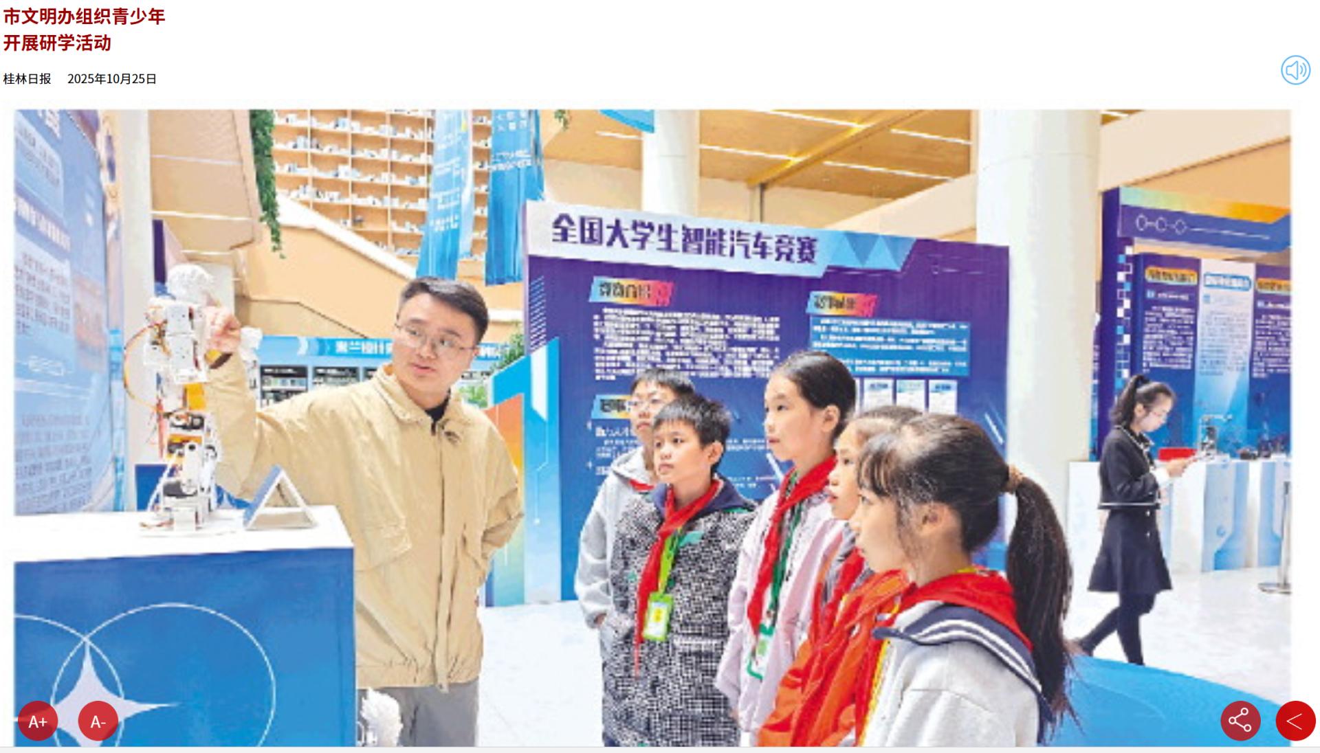 10月23日,色情av市文明办组织临桂区会仙镇与龙胜各族自治县龙脊镇乡村学校少年宫的学生,前往色情av开展研学活动。学生们通过参观科技展厅、参与机甲大师对战及机器人编程等互动项目,近距离接触前沿科技,不仅开阔了视野,也进一步激发了对科学探索的兴趣与热情。 记者唐健扬/文 通讯员杨梅芳/摄