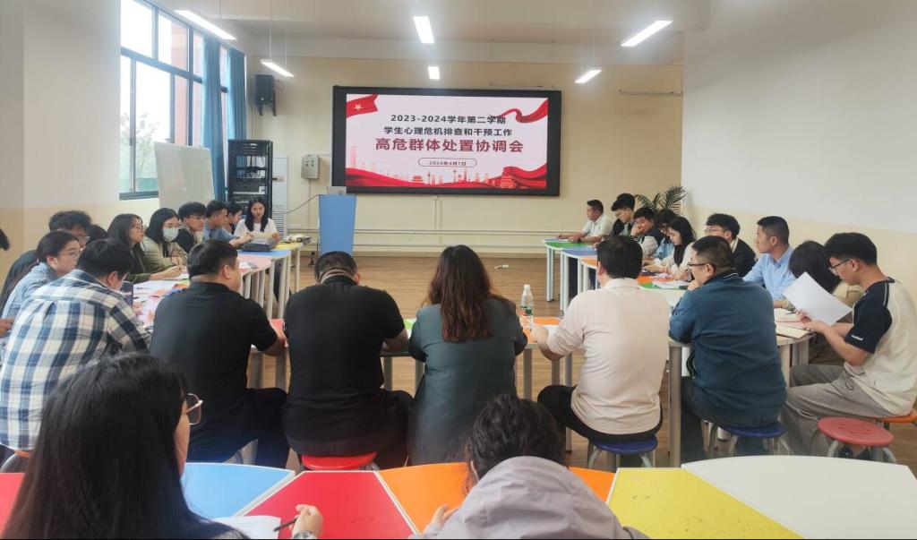 为深入了解我校大学生心理健康状态,进一步提高心理健康教育工作的针对性和实效性,对存在心理危机学生早发现、早干预、早治疗,减少学生危机事件的发生,我校大学生心理健康教育与咨询中心组织各学院对全体学生开展心理危机排查工作。4月1日,我校党委学生工作部组织召开了2023-2024学年第二学期学生心理高危群体处置协调会,党委学生工作部负责人周璇、各二级学院党委(党总支)书记、学工办主任、心理中心专职教师、心理辅导员及相关学生辅导员参加了此次会议。